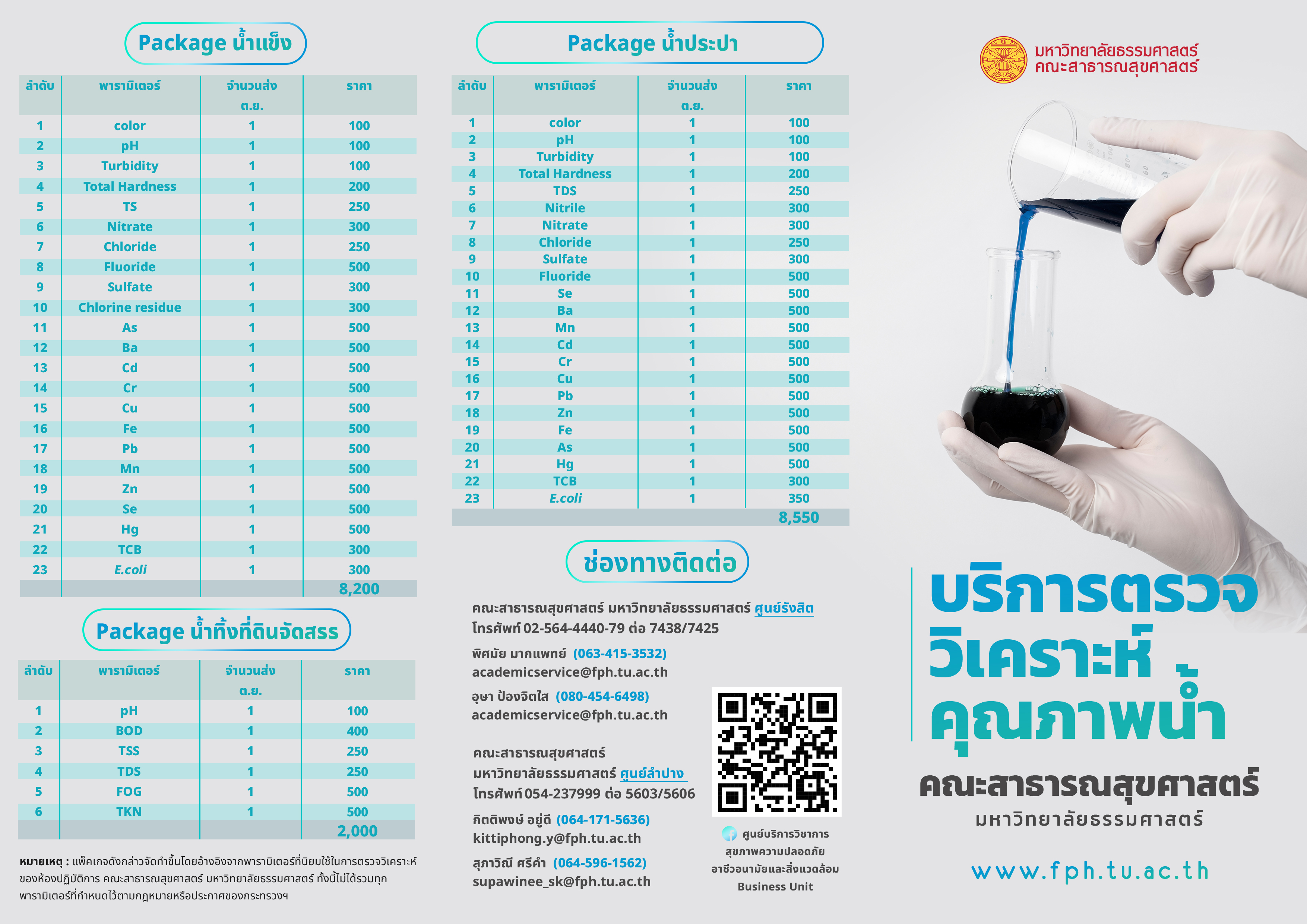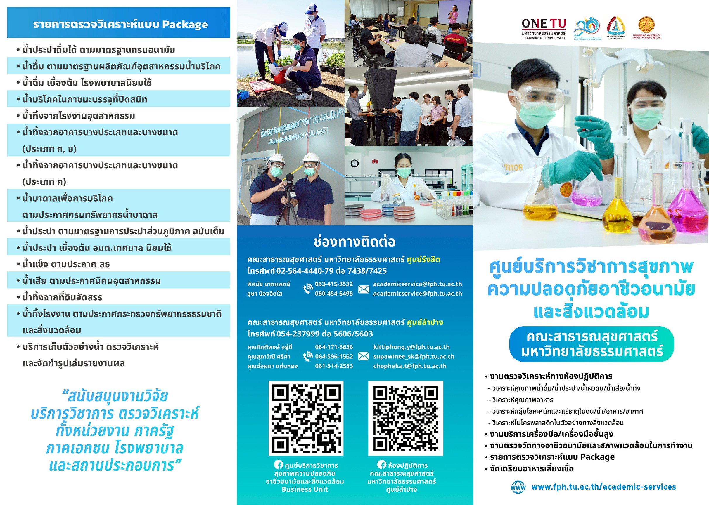 คณะสาธารณสุขศาสตร์ ได้เล็งเห็นความสำคัญของสิ่งเเวดล้อมที่ปัจจุบันได้เกิดปัญหาทางมลพิษขึ้นมากมายตามแหล่งชุมชน และโรงงานอุตสาหกรรม คณะฯ จึงได้พัฒนาห้องปฏิบัติการทางด้านเคมี และจุลชีววิทยา พร้อมบุคลากรที่มีความเชี่ยวชาญ ให้มีขีดความสามารถในการให้บริการด้านการให้คำปรึกษา และตรวจวิเคราะห์คุณภาพน้ำ อาหาร อากาศ และตัวอย่างทางสิ่งเเวดล้อมอื่นๆ ที่ได้มาตรฐานในการรองรับความต้องการของหน่วยงานต่างๆ